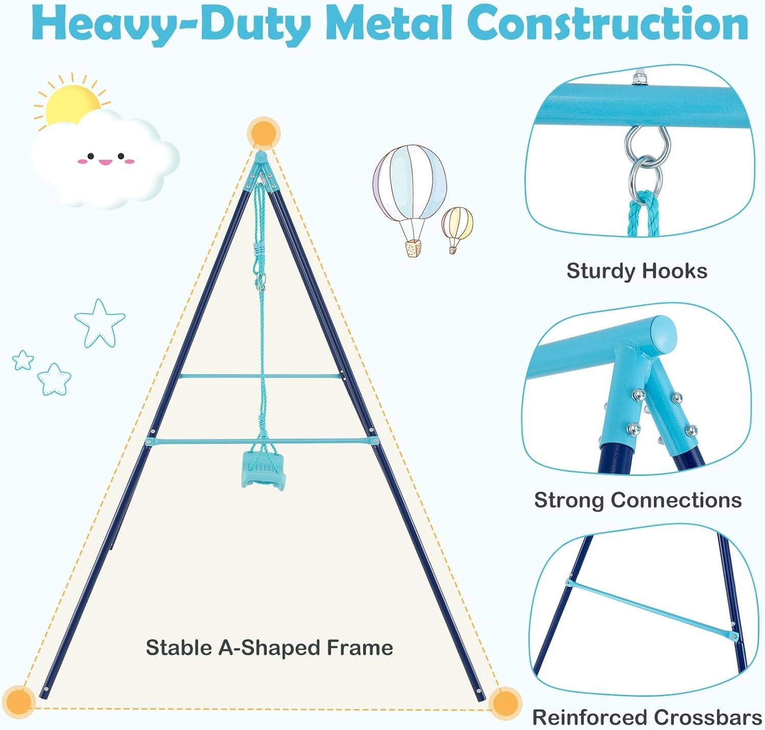 Durability and safety are emphasized through the construction. The frame is made of heavy-duty steel, and the A-frame design provides extra stability. The smooth U-shaped seat is fixed with high-quality PE rope that will not damage delicate skin and boasts high light fastness, preventing fading for years. Furthermore, the U-shape wraps the child’s buttocks securely, preventing sliding down for a better, safer gaming experience, even in windy weather, especially when the included ground stakes are inserted.